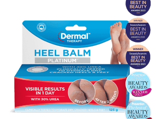 Dermal Therapy Heel Balm Platinum is enhanced with 30% urea, which binds water and retains moisture, providing intense hydration of the skin and loosening flaky layers. Plus, it promotes regeneration of the epidermal barrier, which means smoother heels and softer skin, also suitable for people living with diabetic anhidrosis.